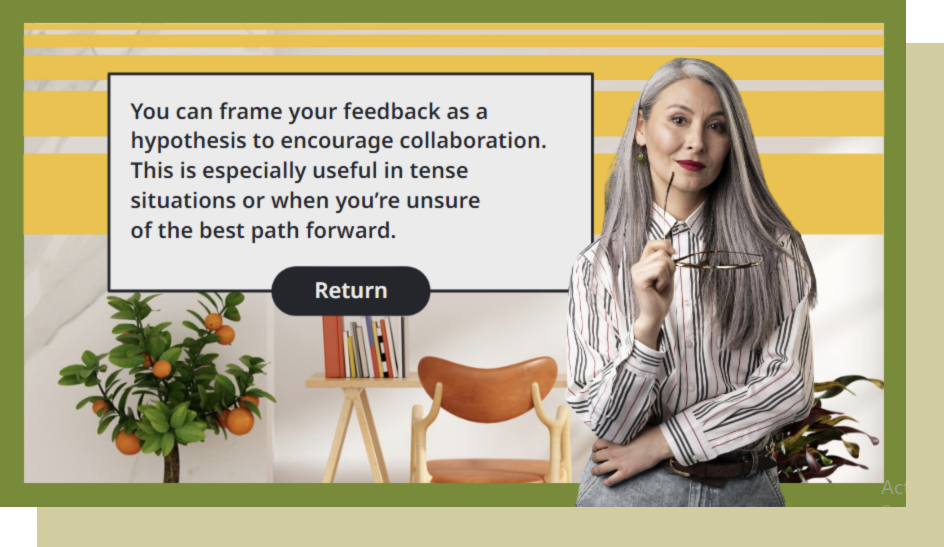This eLearning solution allows new managers to learn and practice feedback skills in a safe virtual environment, building skill and confidence that will result in higher productivity and morale.